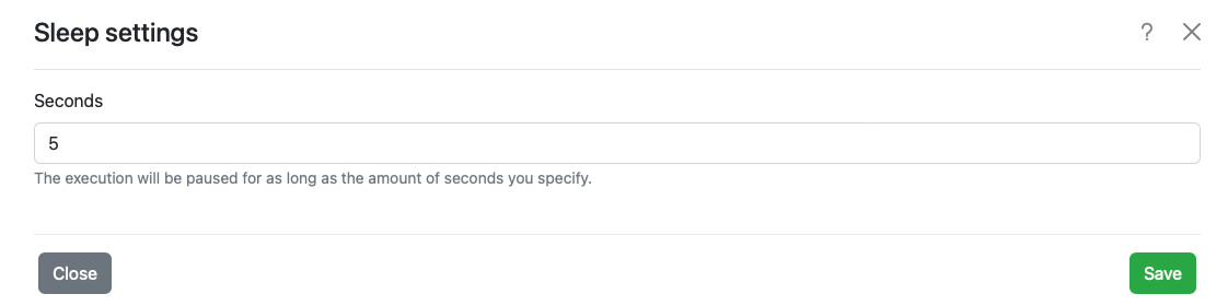 Sleep action can be used to temporary pause the execution flow. If the execution flow reaches this action it will pause the execution for as many seconds as the number you specify in the settings.